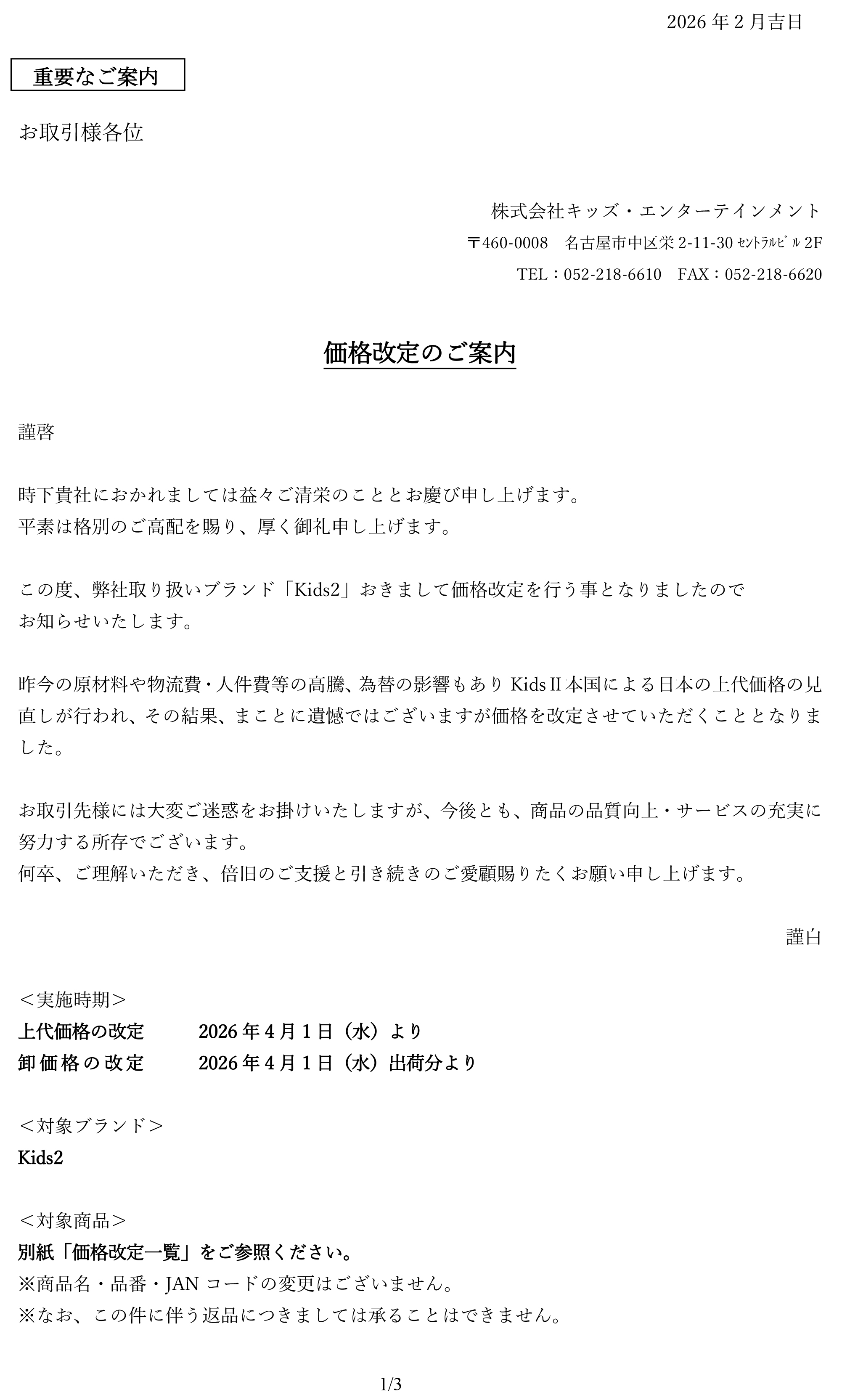 価格改定のご案内(2026年4月1日~) KidsⅡ商品